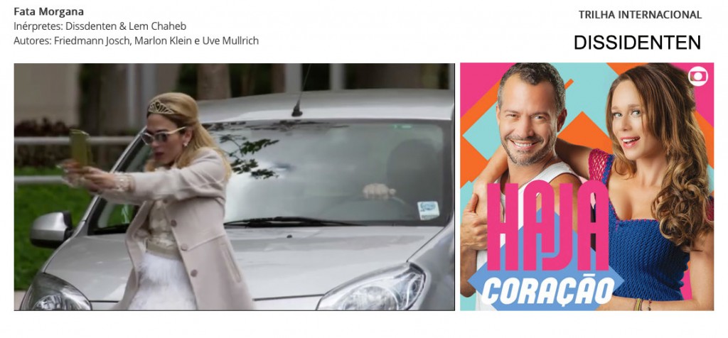 2016 – Dissidenten’s song “Fata Morgana” became again a title song of the new Brazilian telenovela called “Haja Coração”. Produced and broadcast by Rede Globo, based on the 1987 classic telenovela “Sassaricando”, created by Silvio de Abreu. With 185 TV chapters of Sassaricando and ‘Fata Morgana”’ as title song, “Fata Morgana” became one of the biggest hits of Dissidenten in South America. The song was covered by various Brazilian Artists.