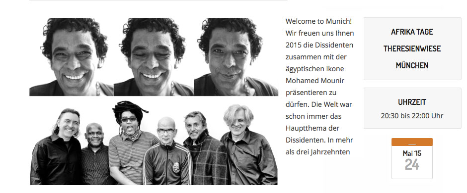 moreDissidenten feat. Mohamed Mounir. Welcome to Munich! Wir freuen uns Ihnen 2015 die Dissidenten zusammen mit der ägyptischen Ikone Mohamed