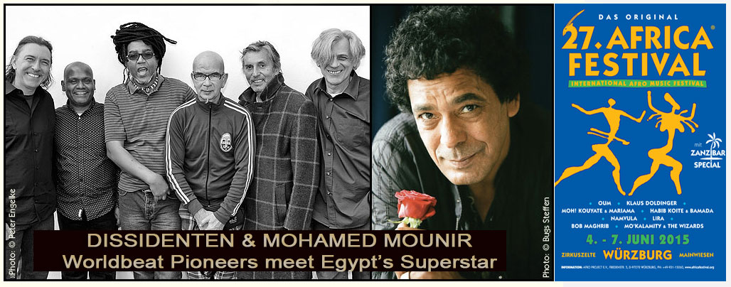 moreThe famous Egyptian singer ‘Mohamed Mounir’ and Berlin’s worldmusic pioneers ‘Dissidenten’ play together at this year’s Africa Festival in Würzburg